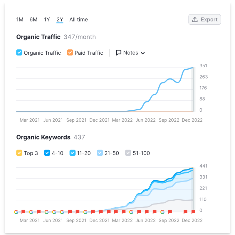 - Their organic keywords increased from nearly 0 at the start of the project to an estimated ~437 additional keywords ranked