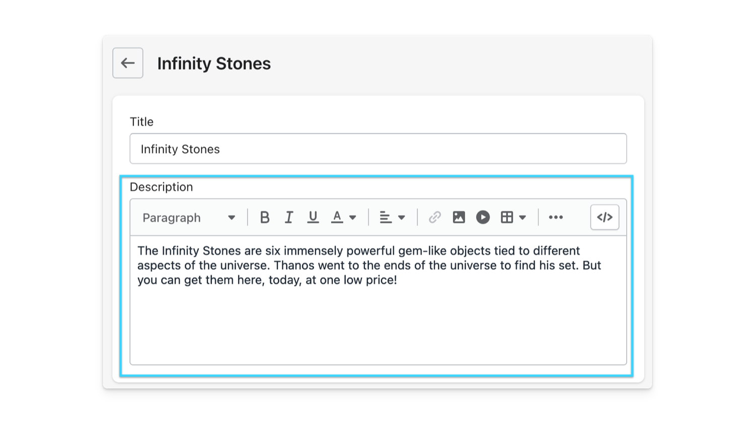 Can it be longer? Sure, but you want to aim to have just enough content in your collection description so it isn’t overwhelming to a visitor. This is a description, after all – not an article. (You can, however, link to a blog post or page you write that goes into greater detail on that collection description with featured recommended products.)