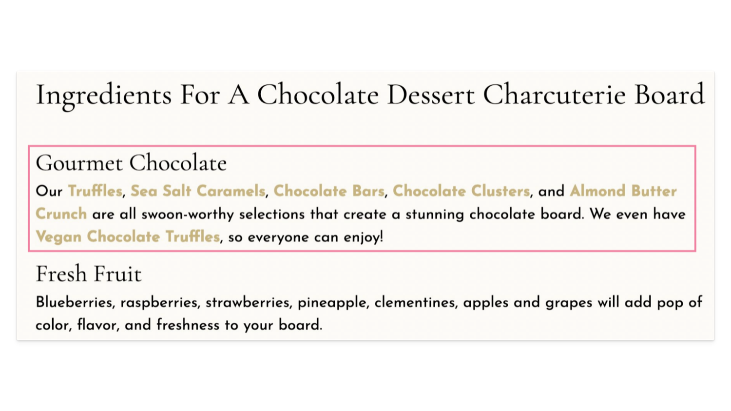 Here’s a great example of internal links on an e-commerce store pointing from a blog post to relevant products and collections (via Lake Champlain Chocolate’s guide to a DIY Chocolate Dessert Charcuterie Board).