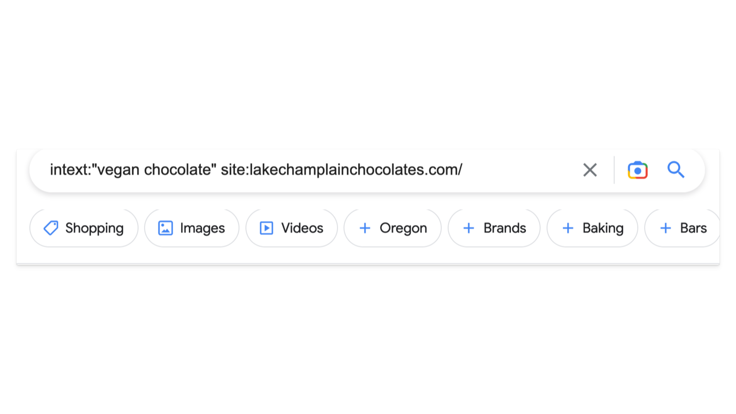 You’d search for “vegan chocolate” site:lakechamplainchocolates.com/ and that’d show you all the pages on your site relevant to that keyword.