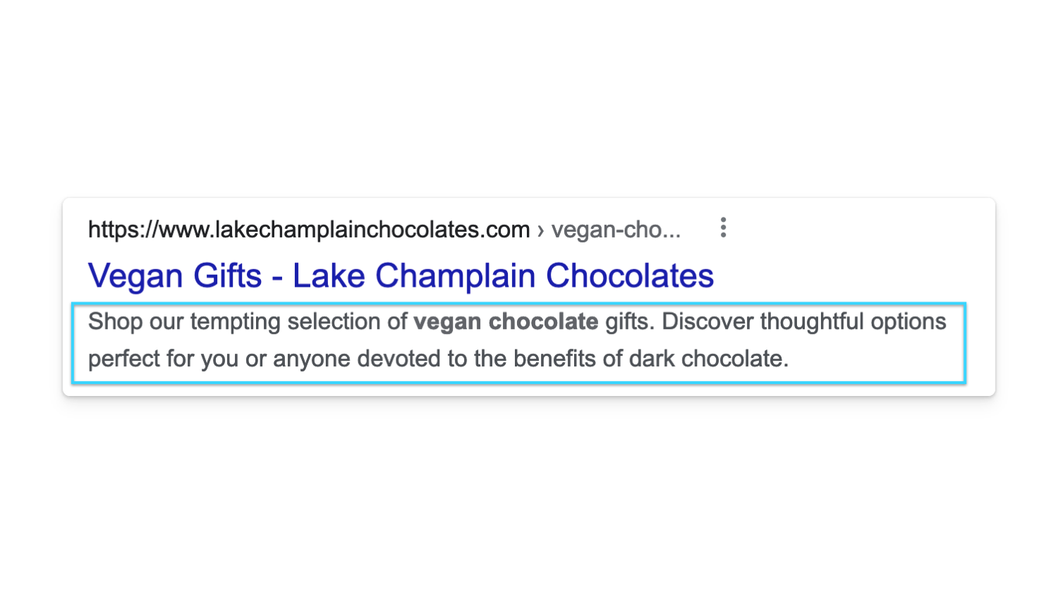 Here’s an example Shopify meta description for a collection on Lake Champlain Chocolate for a collection targeting Vegan Chocolate Gifts: